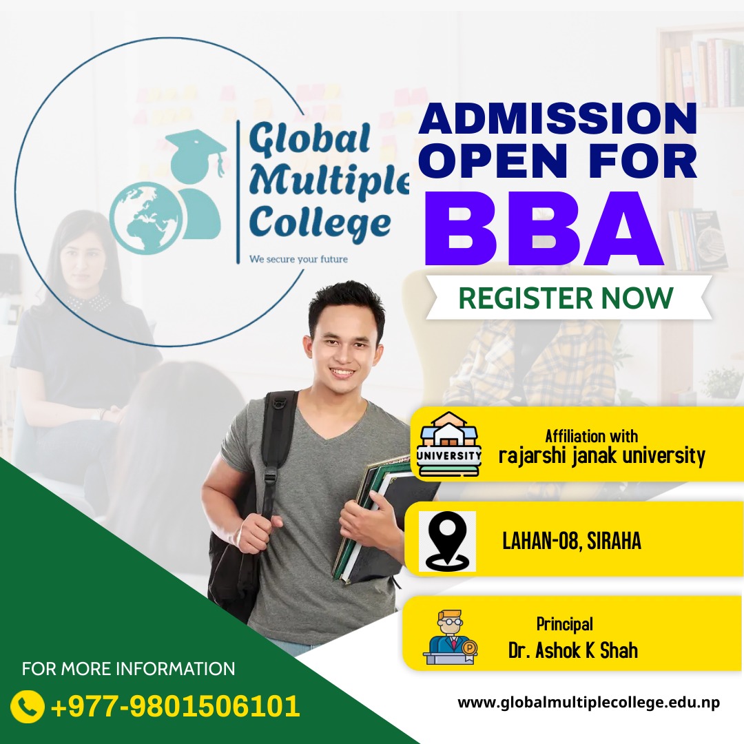 Global Multiple College (GMC), established in 2080, envisioned as the center of excellence for Management education in Nepal is committed to provide best resources to students and practical based education using state of art technology blended teaching, learning and research environment. The college runs Bachelor of Business Administration (BBA) affiliated to Rajarshi Janak University (RJU)), Nepal.